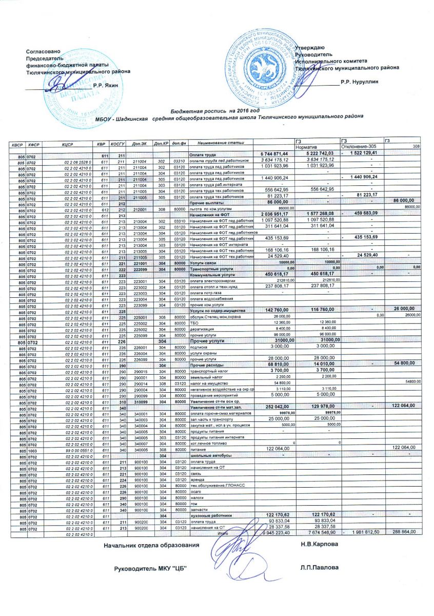 Бюджетная роспись на 2016 год МБОУ Шадкинская СОШ Тюлячинского муниципального района