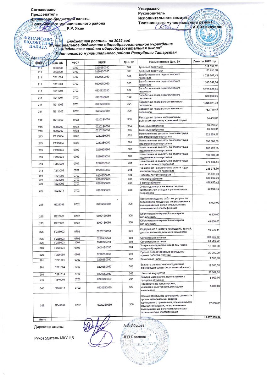 Бюджетная роспись на 2022 год МБОУ - Шадкинская СОШ Тюлячинского муниципального района