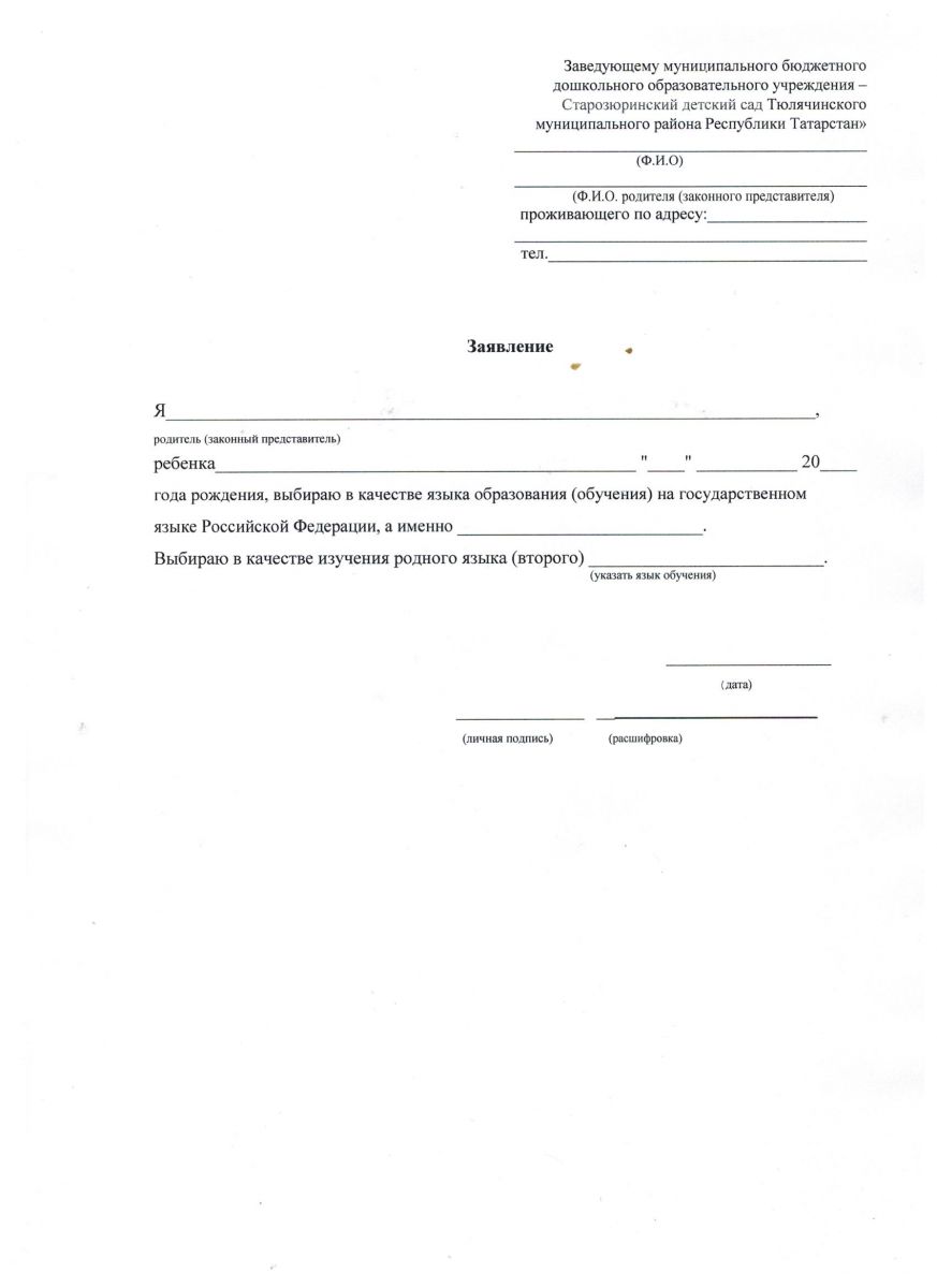 Образец заявления о выбере языка образование/Белем бирү телен сайлау гаризасы