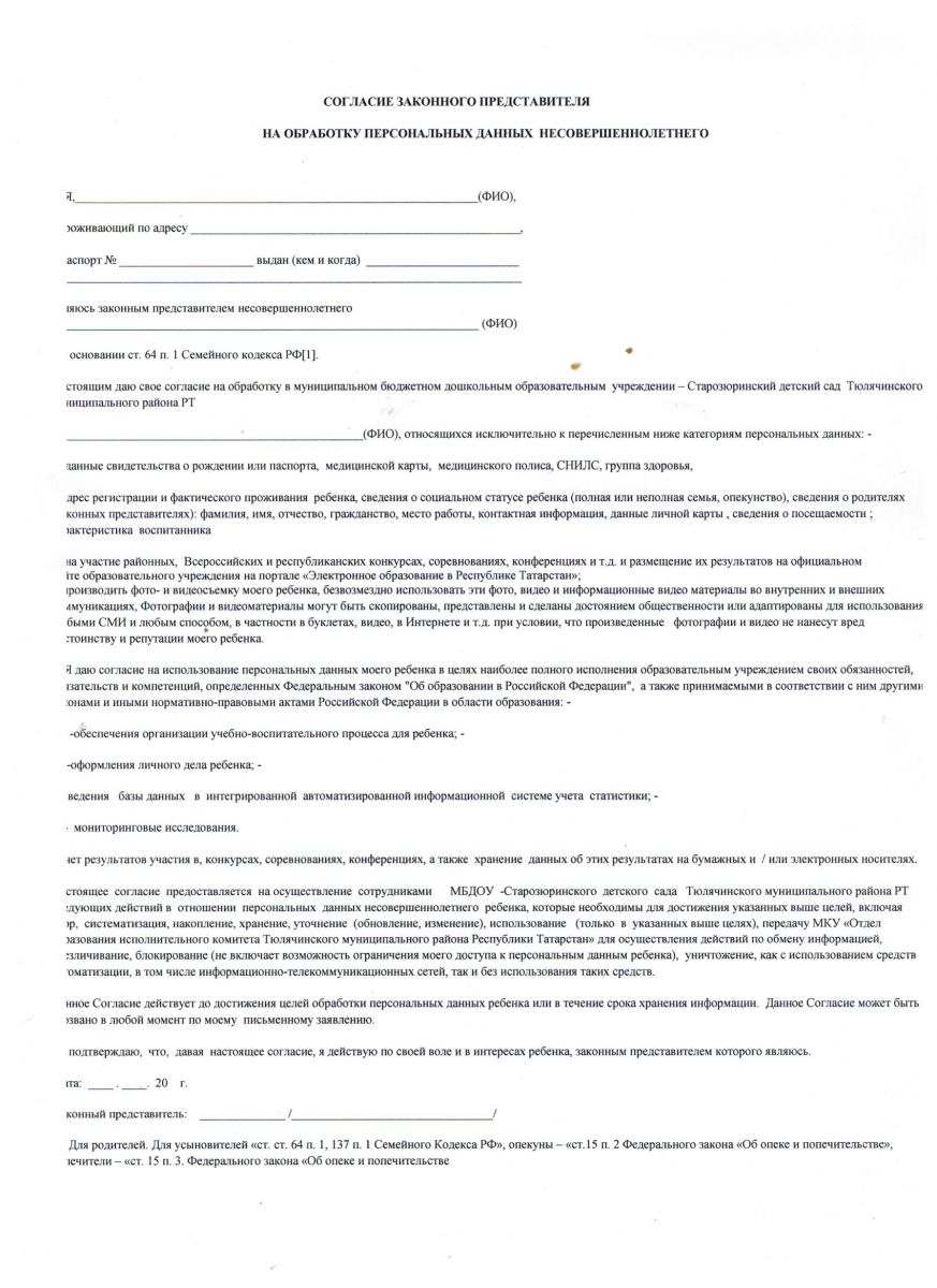 Образец согласия законного представителя на обработку персональных данных несовершеннолетнего /Балигъ булмаганнарның шәхси мәгълүматларын куллану буенча законлы вәкилнең ризалыгы үрнәге