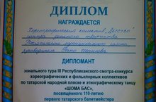 Танцевальный коллектив "Детство" Малокибякозинской основной и Большекибякозинской начальной школы под руководством педагога ДО ЦДТ Шаиповой Р.И. участвовал в Сабах в зональном туре III Республиканского смотра-конкурса хореографических и фольклорных коллективов по татарской народной пляске и этнографическому танцу «Шома бас», посвященного 110 летию первого татарского балетмейстера Гая Тагирова и стали Дипломантами. Поздравляем!
