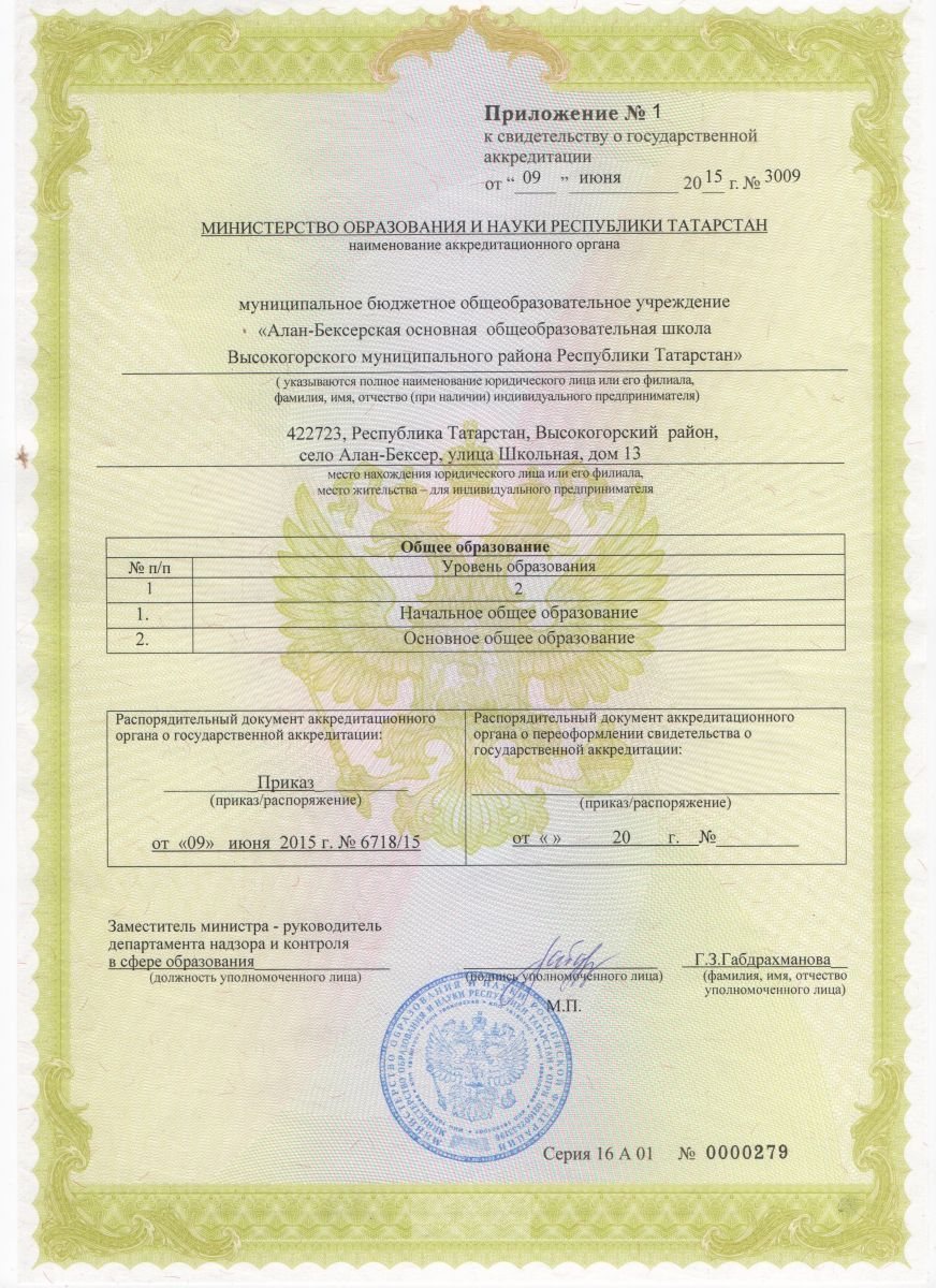 Приложение №1 к свидетельству о государственной аккредитации от 09 июня 2015 года № 3009