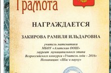 Учитель математики, Закирова Рамиля Ильдаровна, стала лауреатом муниципального этапа Всероссийского конкурса "Учитель года-2016" в номинации: "Шаг в науку". Молодец! Желаем дальнейших успехов! -