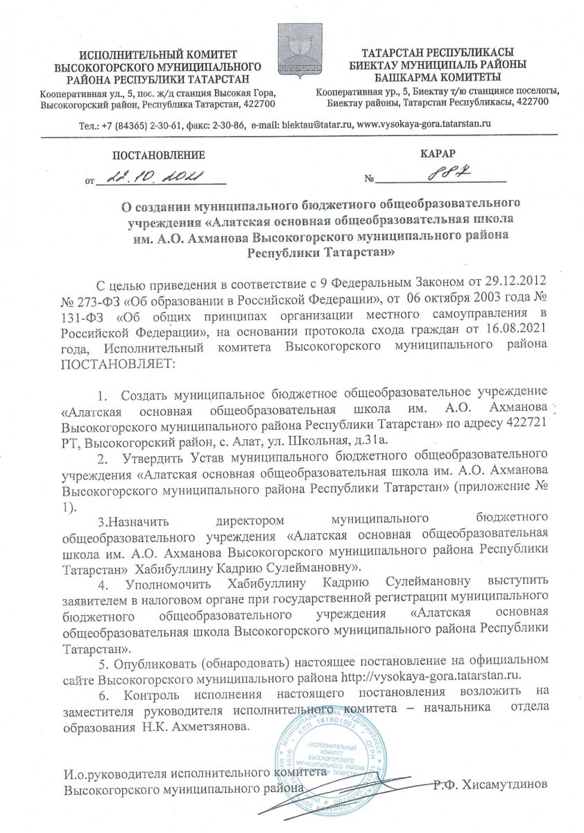 Муниципальное бюджетное общеобразовательное учреждение "Алатская основная общеобразовательная школа им. А.О.Ахманова Высокогорского муниципального района Республики Татарстан"/Татарстан Республикасы Биектау муниципаль районы "А.О. Ахманов исемендәге Алат төп гомуми белем мәктәбе" муниципаль бюджет гомуми белем учреждениесе
