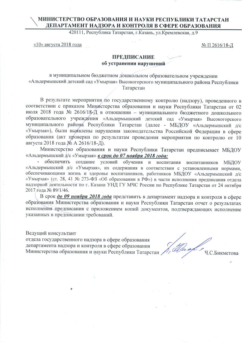 Предписание МО и РТ Департамента иконтроля в сфере образования от 10.08.2018г