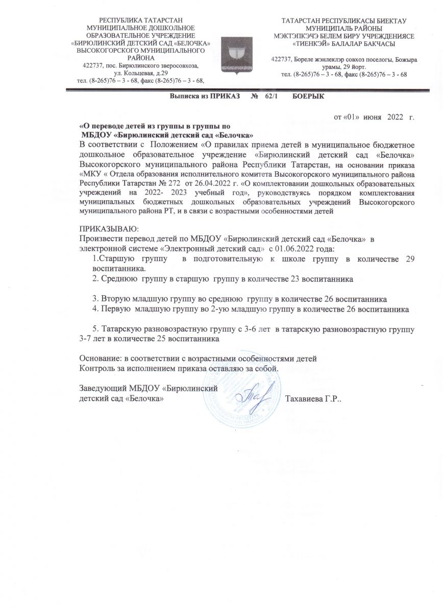 Выписка из приказа о переводе детей из группы в группу на 2022-2023 учебный год.