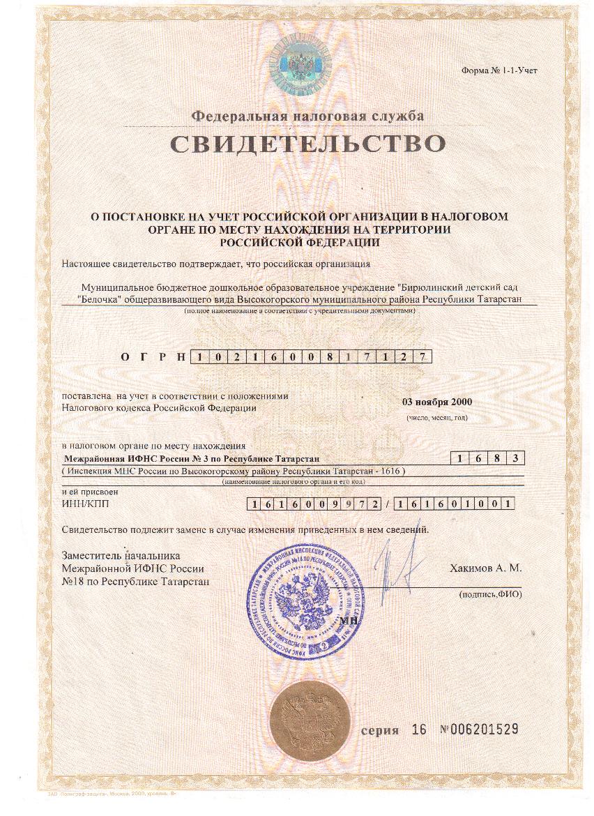 свидетельство о поставке на учет Российской организации в налоговом органе