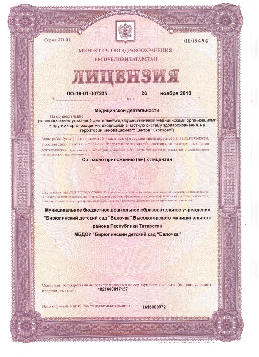 Муниципальное бюджетное дошкольное образовательное учреждение «Бирюлинский детский сад «Белочка» Высокогорского муниципального района Республики Татарстан