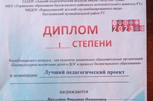 Поздравляем педагога Яруллину Фирдавес Нажиповну с получением диплома I степени в Республиканский конкурс для педагогов дошкольных образовательных организаций "Поликультурное воспитание детей в ДОУ в процессе билингвального образования" в номинации "Лучший педагогический проект".