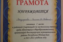 Ученица 6 класса нашей школы Фазулзанова Ралина заняла 1 место в районной Спартакиаде по настольному теннису среди обучающихся общеобразовательных организаций Высокогорского муниципального района Республики Татарстан в 2021-2022 учебном году.