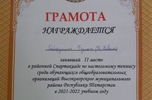 Ученик 9 класса нашей школы Гайфуллин Булат занял 2 место в районной Спартакиаде по настольному теннису среди обучающихся общеобразовательных организаций Высокогорского муниципального района Республики Татарстан в 2021-2022 учебном году.