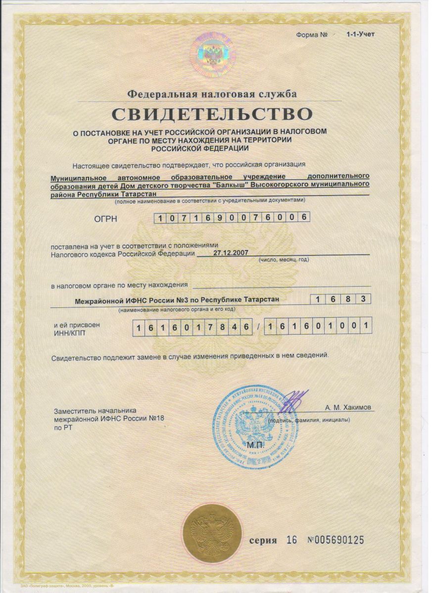 Свидетельство о постановке на учет в налоговом органе