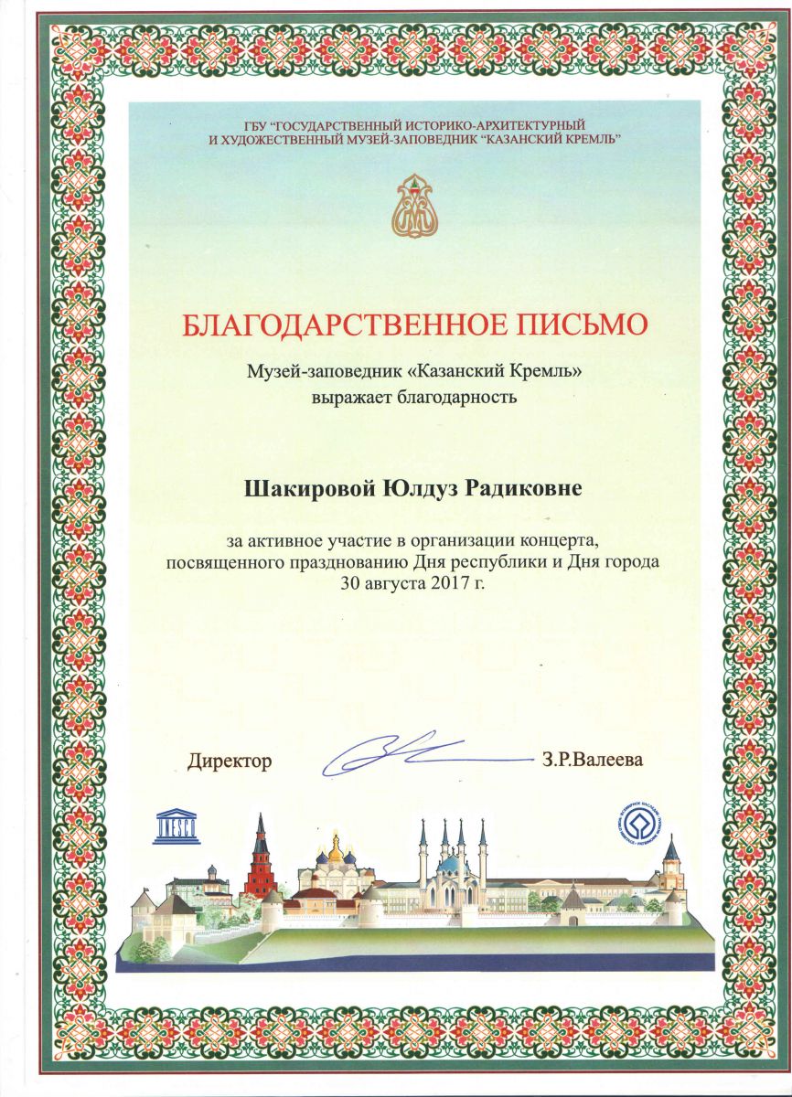 Шакирова Юлдуз Радиковна - Благодарственное письмо, Казанский Кремль, 30 августа 2017 г.