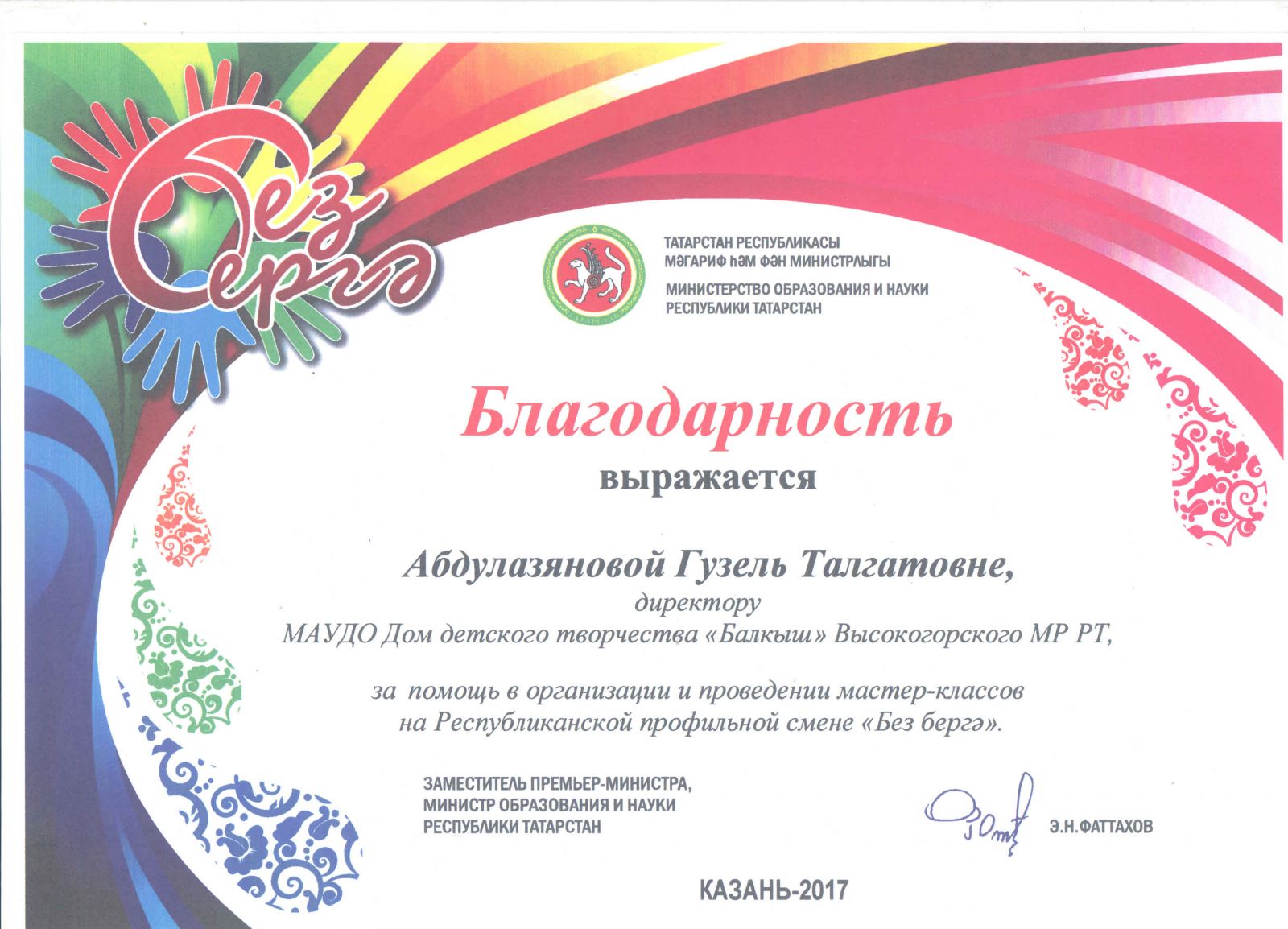 Абдулазянова Гузель талгатовна - республиканская профильная смена "Без бергэ",благодарность