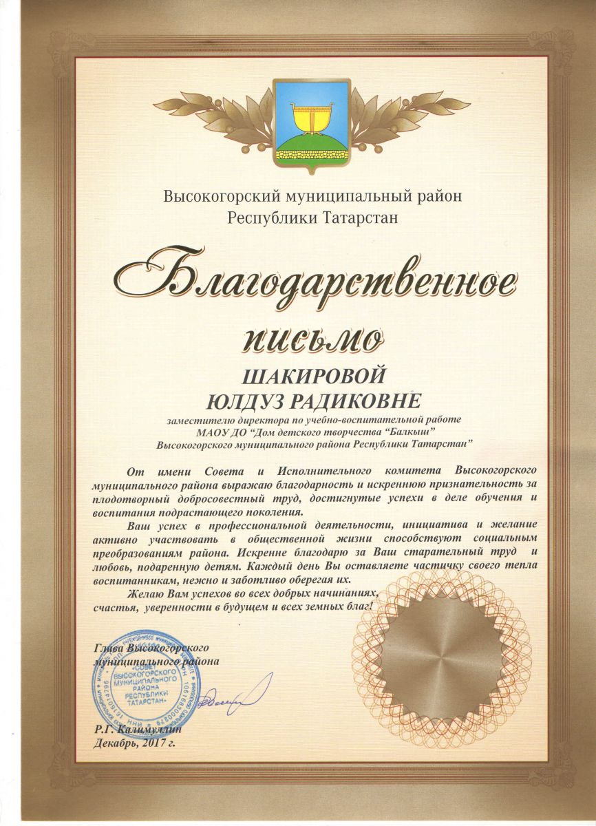 Шакирова Юлдуз Радиковна - Благодарственное письмо Главы Высокогорского муниципального района РТ