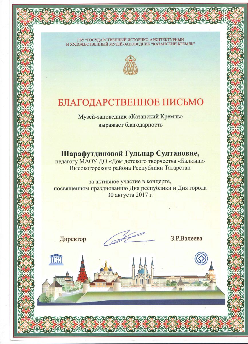 Шарафутдинова Гульнар Султановна - Благодарственное письмо, Казанский Кремль, 30 августа 2017 г.