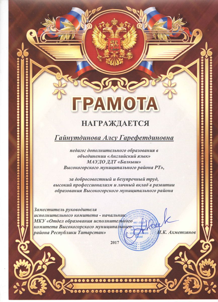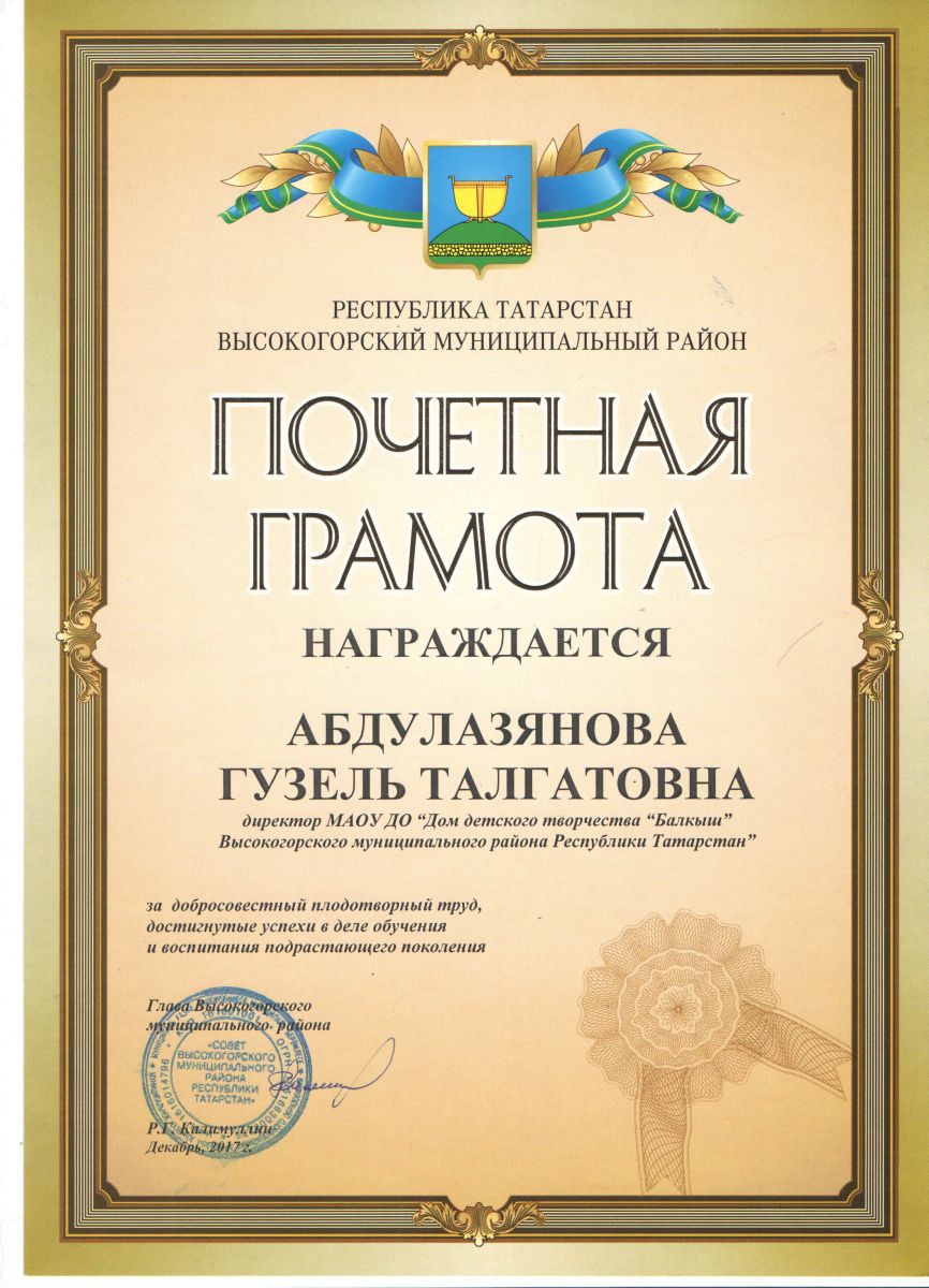 Абдулазянова гузель талгатовна - Почетная грамота Главы Высокогорского муниципального района РТ