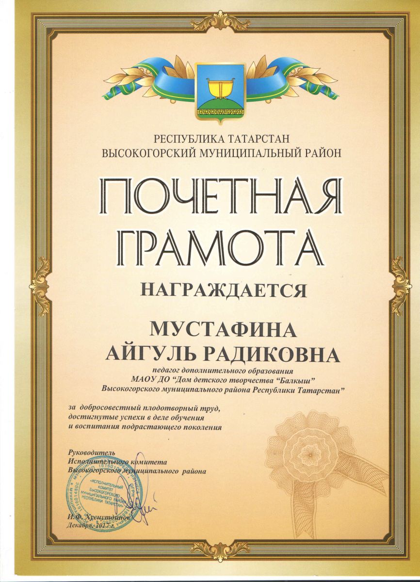 Мустафина Айгуль Радиковна - Грамота Исполкома Высокогорского муниципального района РТ