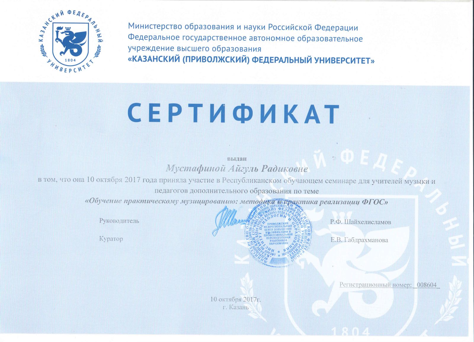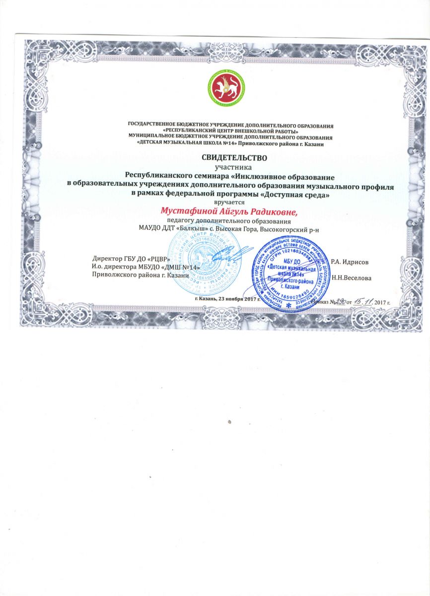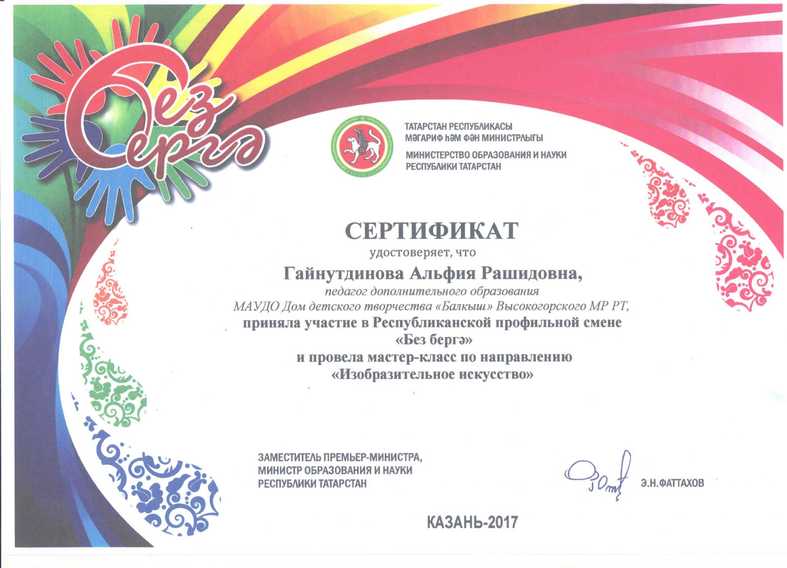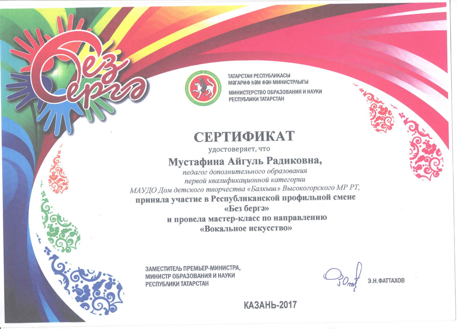 Мустафина Айгуль Радиковна -мастер-класс в Республиканской профильной смене "Без бергэ", сертификат