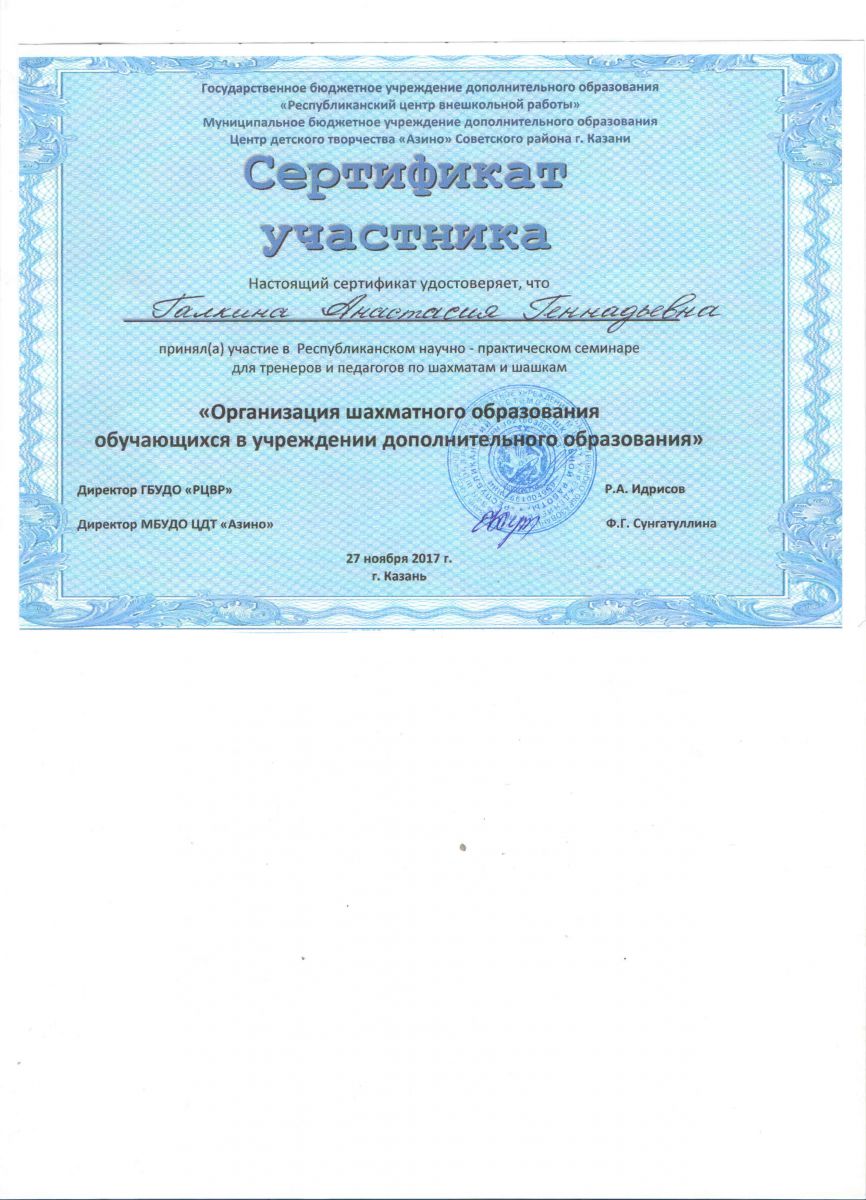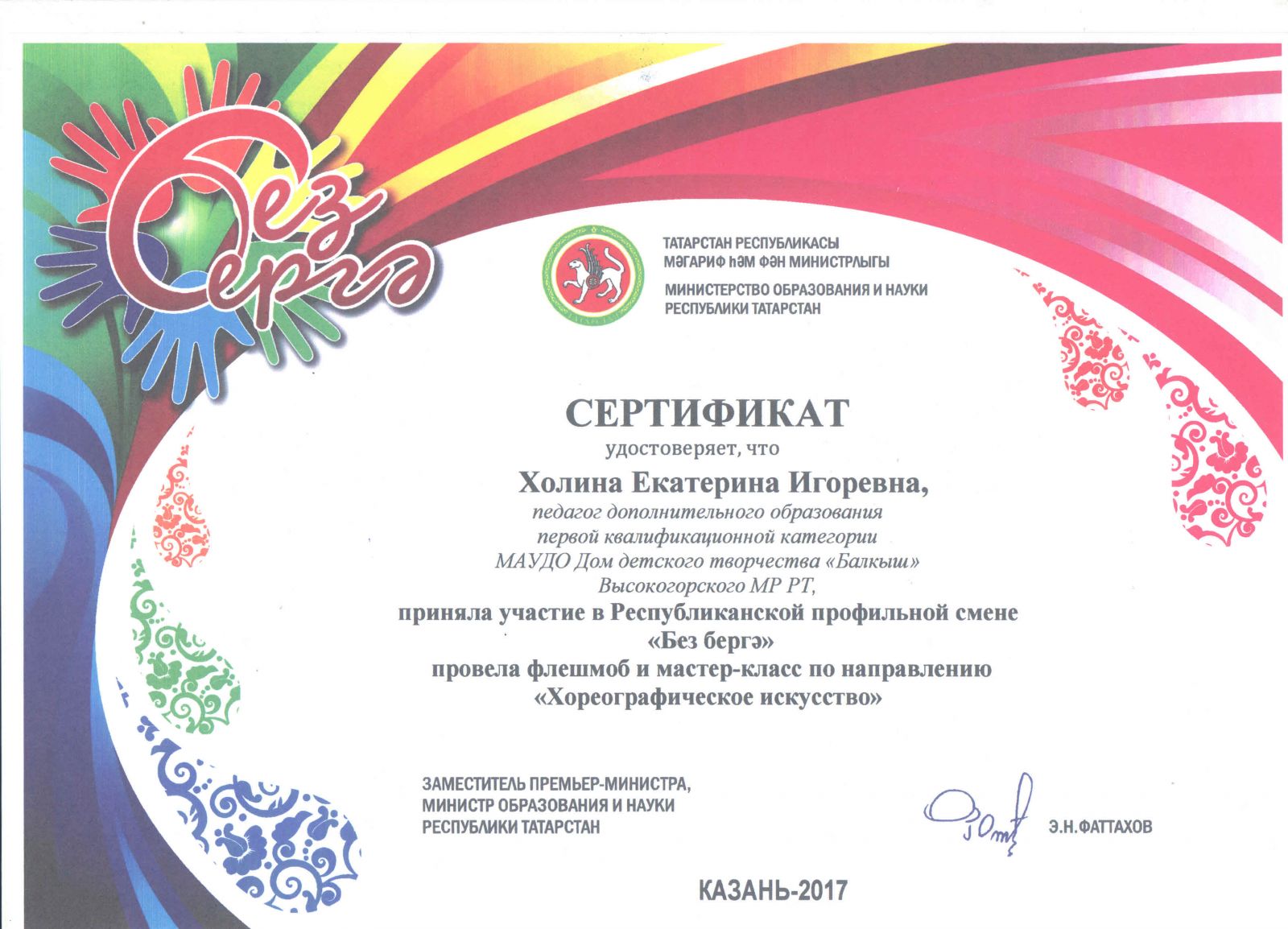 Холина Екатерина Игоревна - мастер-класс в Республиканской профильной смене"Без бергэ", сертификат