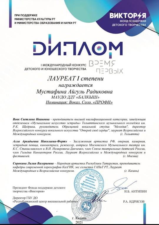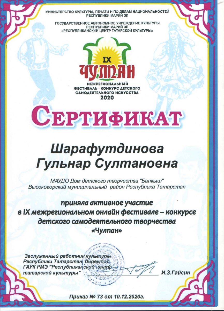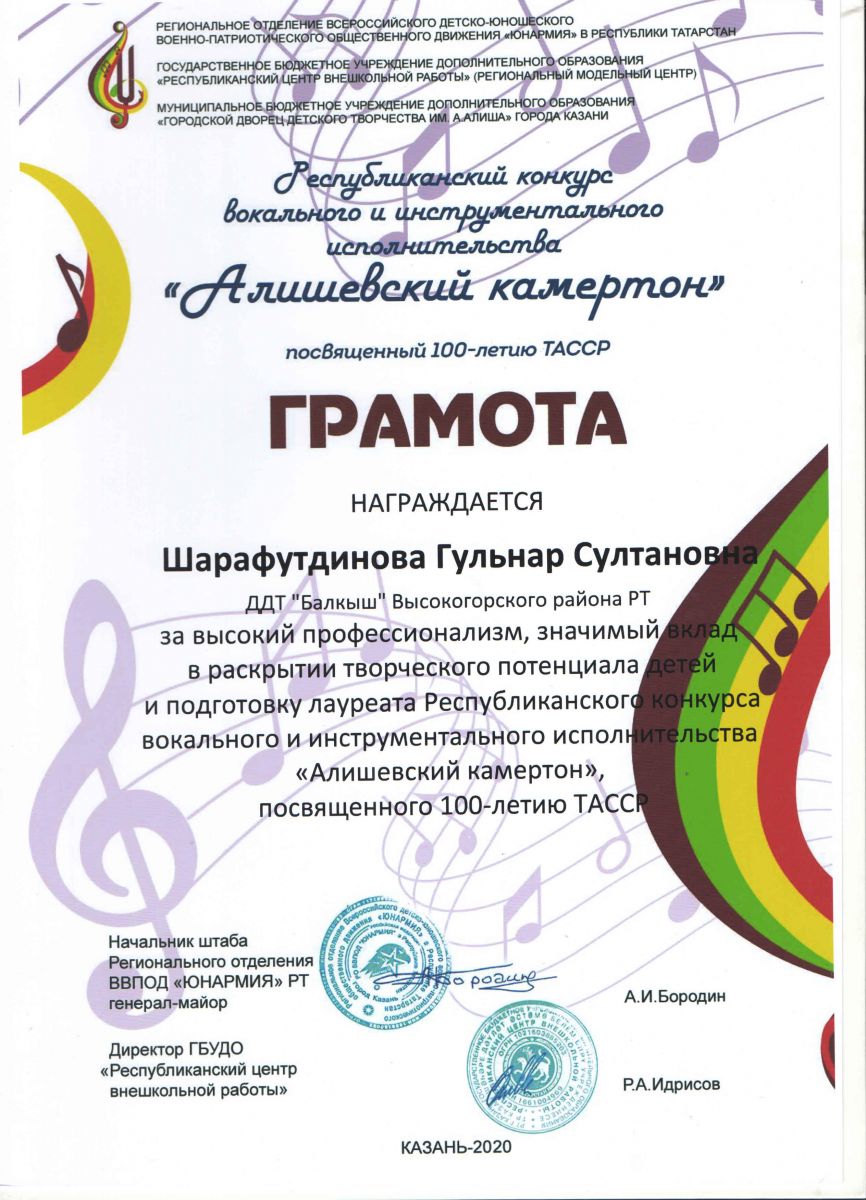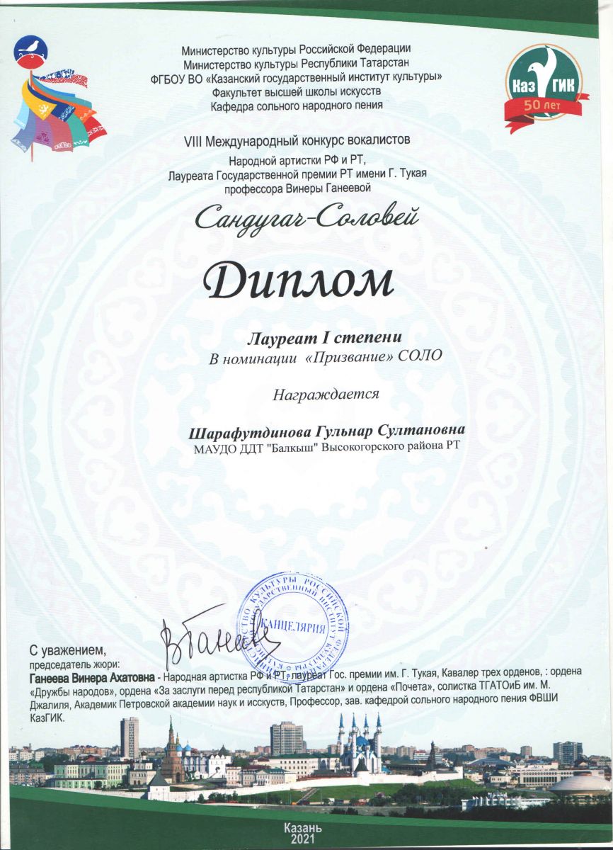 Шарафутдинова Гульнар Султановна - МеждСународный конкурс вокалистов "Сандугач-Соловей", лауреат 1 степени