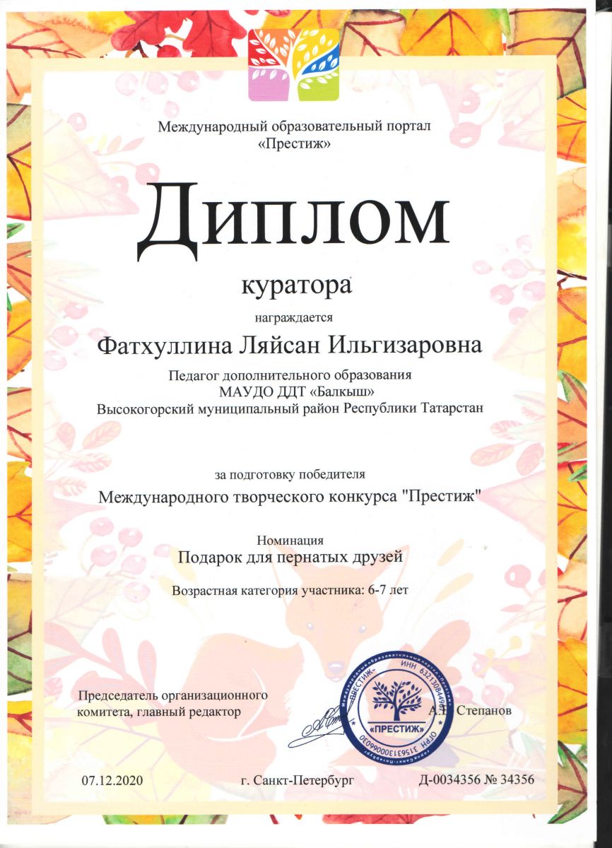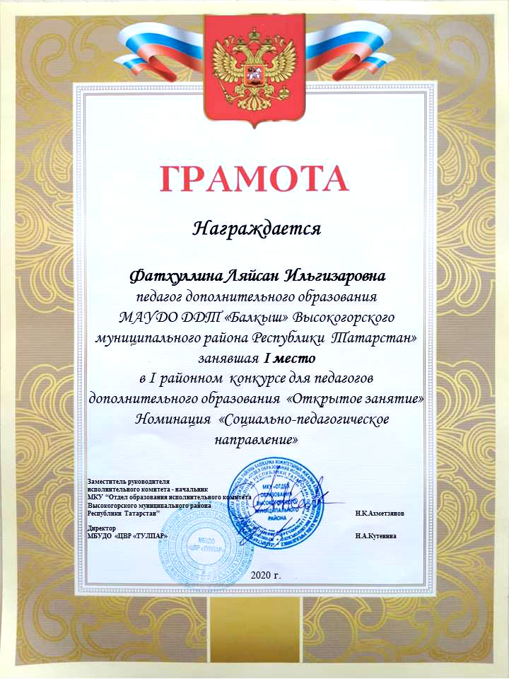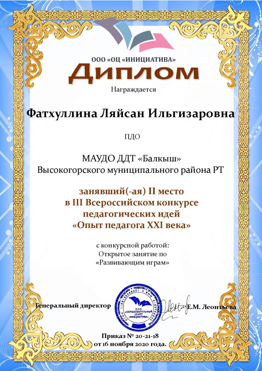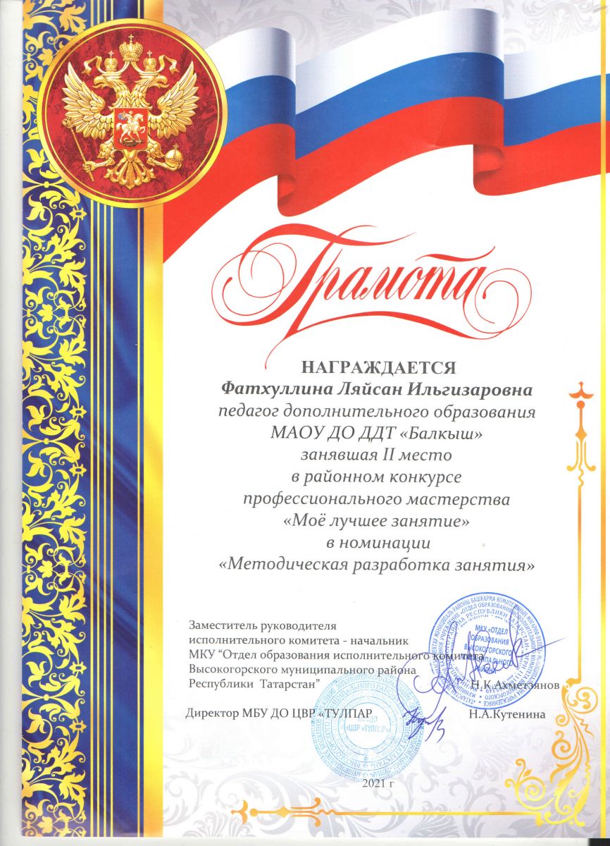 Фатхуллина Ляйсан Ильгизаровна - районный конкурс проф.мастерства "Мое лучшее занятие", 2 место
