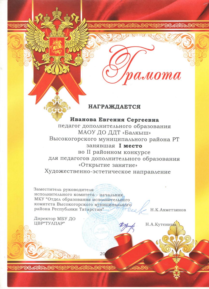 Иванова Евгения Сергеевна - районный конкурс проф.мастерства "Открытое занятие", 1 место
