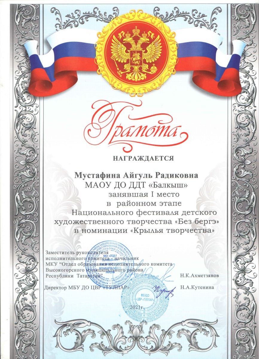 Мустафина Айгуль Радиковна - районный этап конкурса "Без бергэ", 1 место