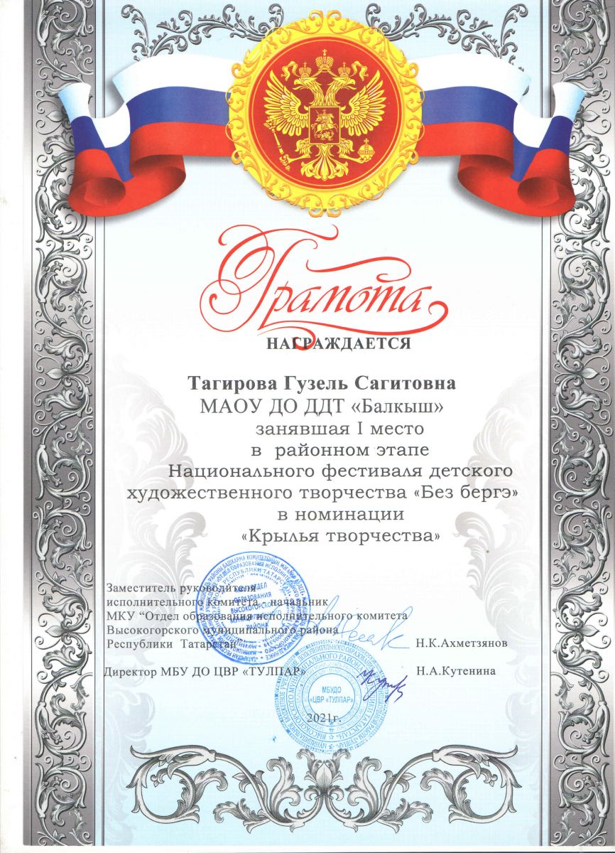 Тагирова Гузель Сагитовна - районный этап конкурса "Без бергэ", 1 место