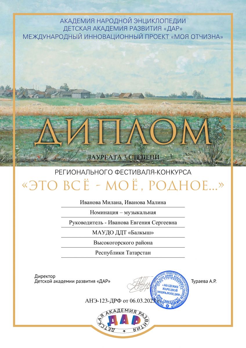 Иванова Милана, Иванова Малина - региональный конкурс "Это всё- моё, родное", лауреат 3 степени