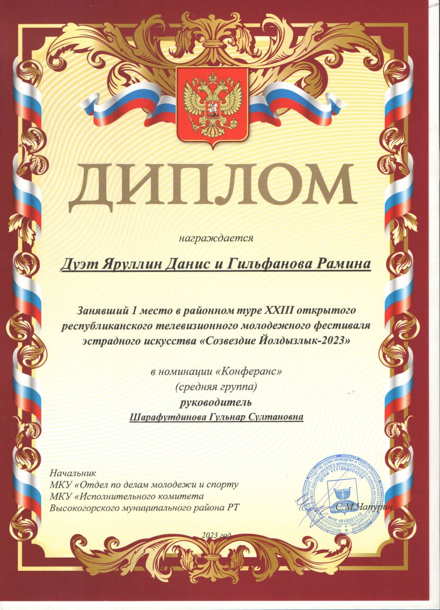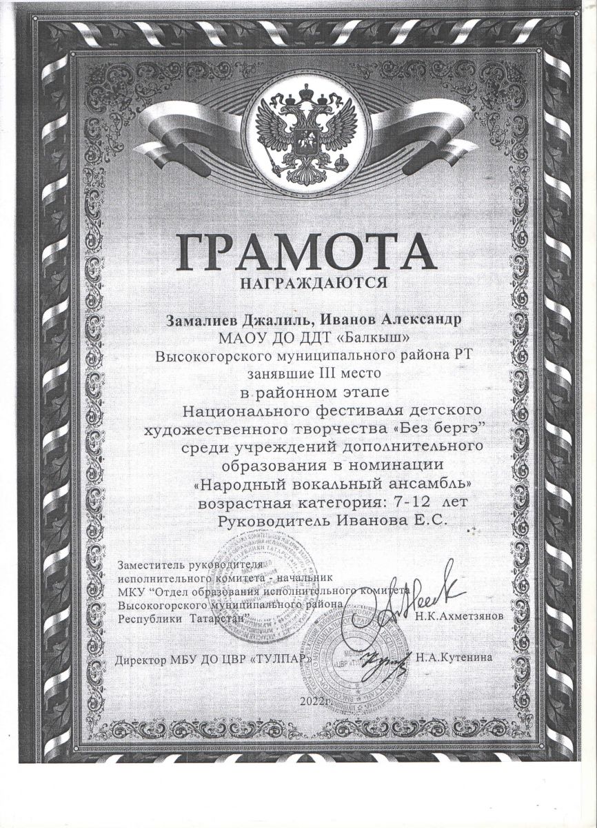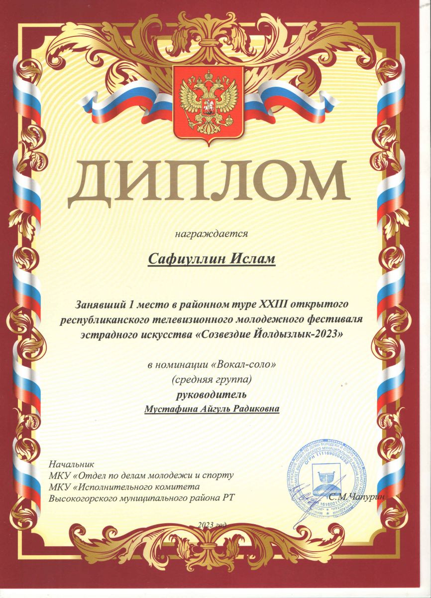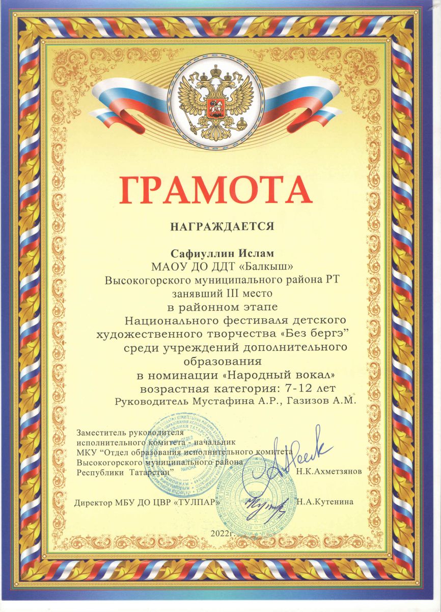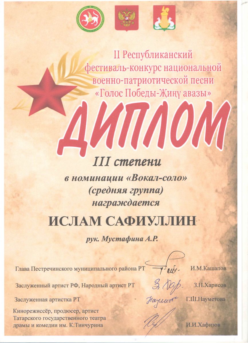 Сафиуллин Ислам - Национальный фестиваль детского художественного творчества "Без бергэ", 3 место