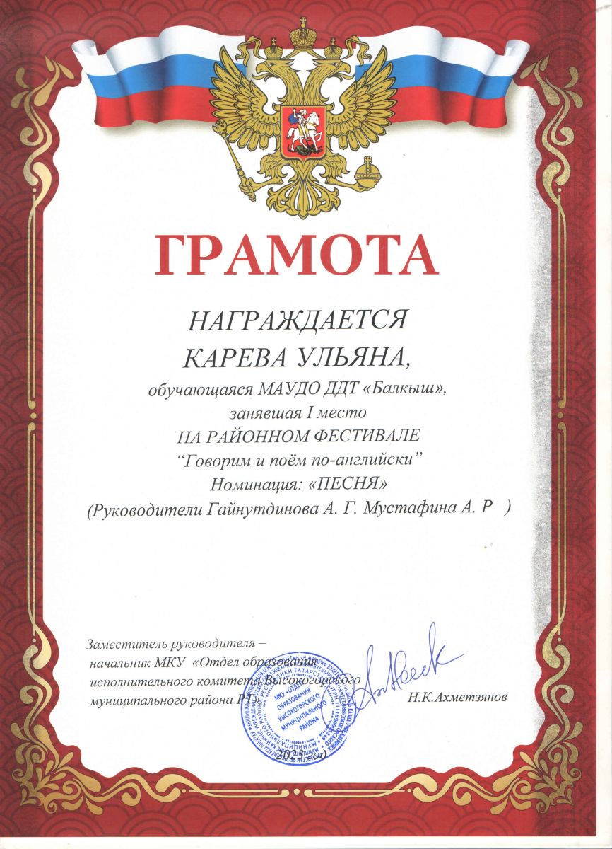 Карева Ульяна - районный фестиваль-конкурс "Говорим и поем по-английски", 1 место