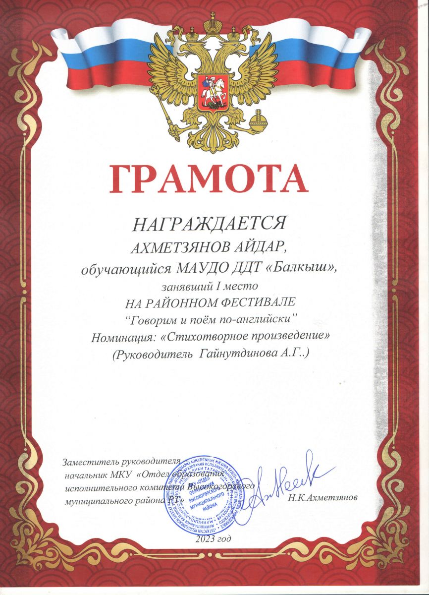 Ахметзянов Айдар - районный фестиваль-конкурс "Говорим и поем по-английски",1 место
