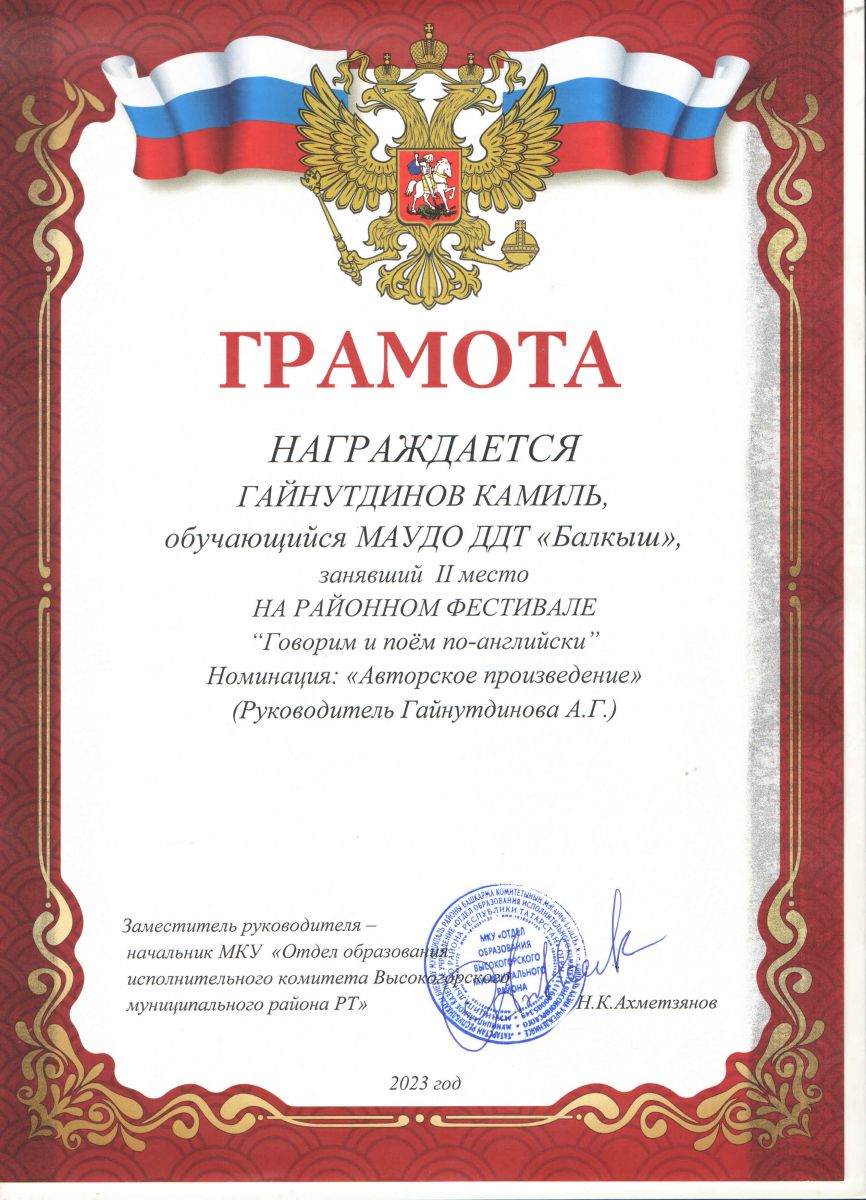 Гайнутдинов Камиль - районный фестиваль-конкурс "Говорим и поем по-английски", 2 место