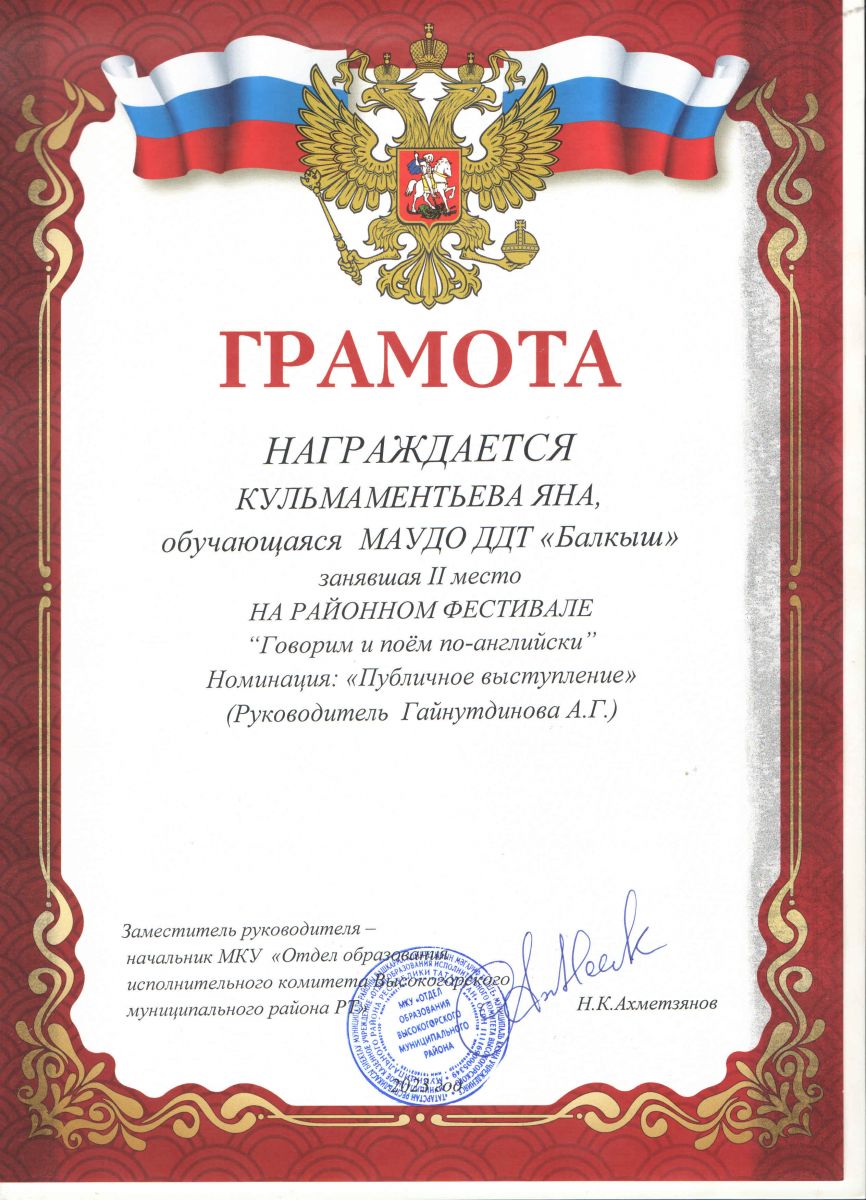 Кульмаментьева Яна - районный фестиваль-конкурс "Говорим и поем по-английски", 1 место