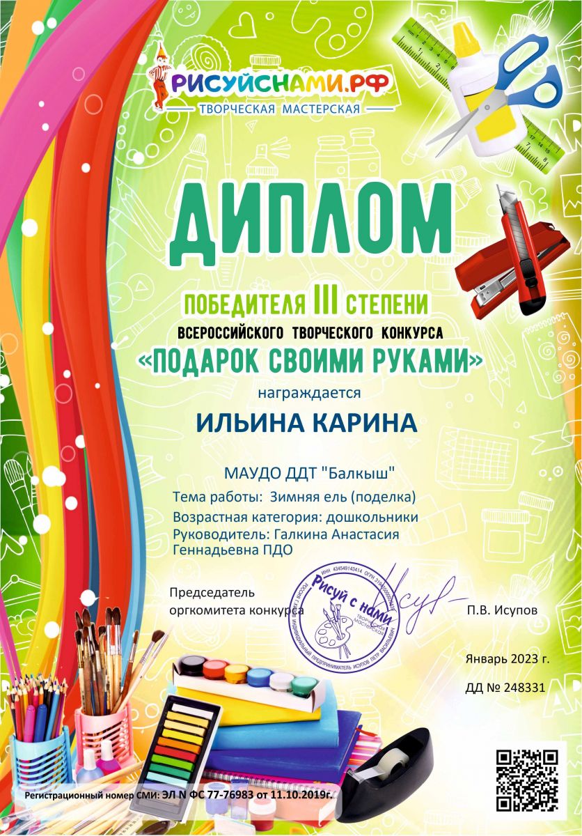 Ильина Карина - всероссийский творческий конкурс "Подарок своими руками", 3 место