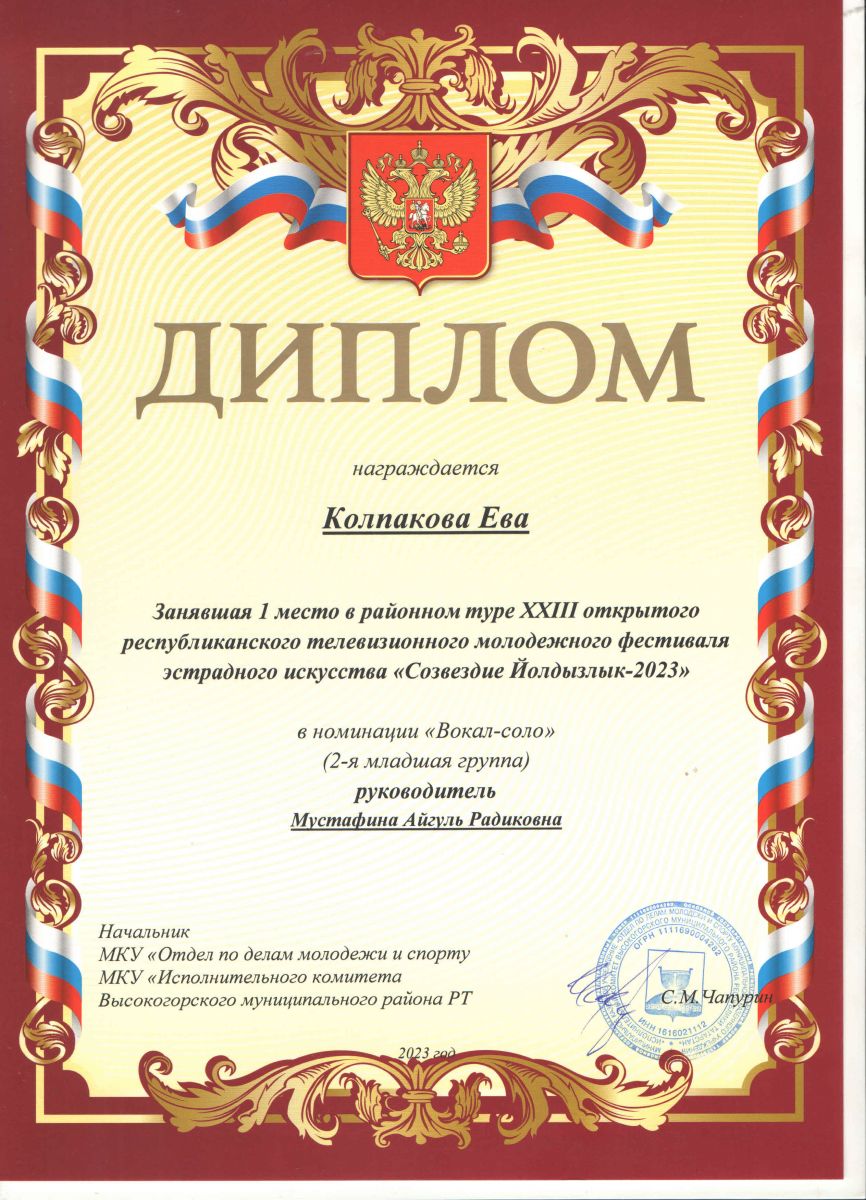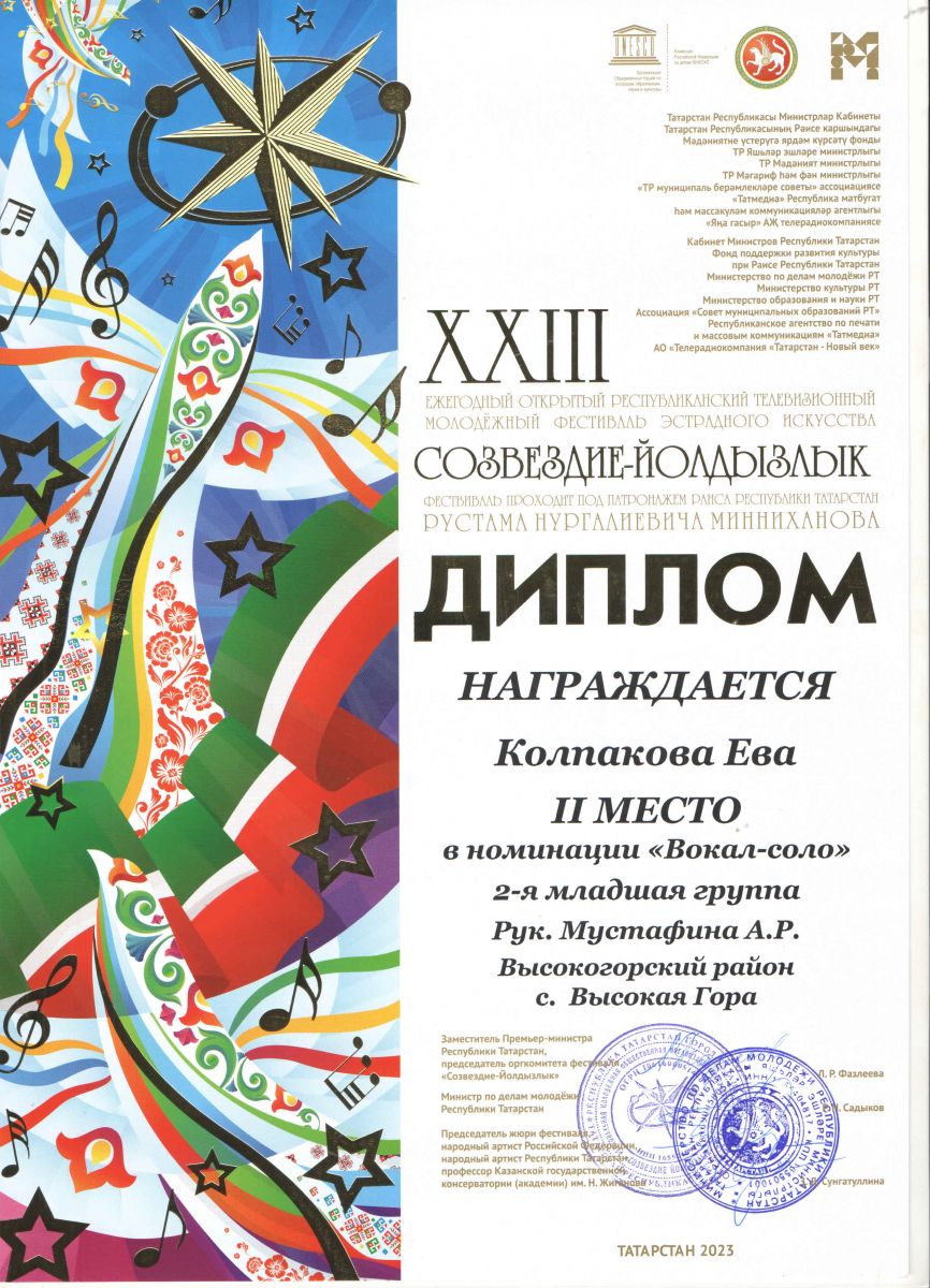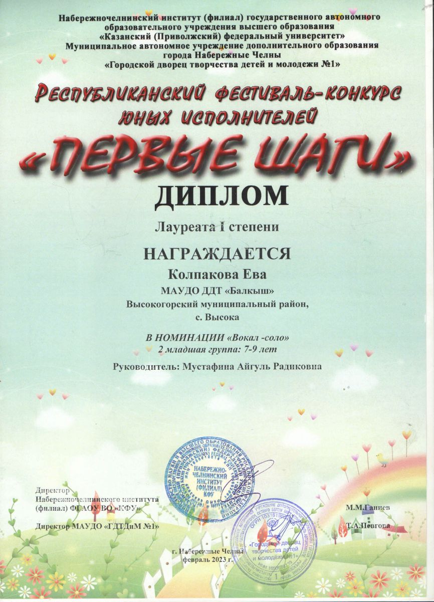 Колпакова Ева - Республиканский фестиваль-конкурс юных исполнителей "Первые шаги", лауреат 1 степени