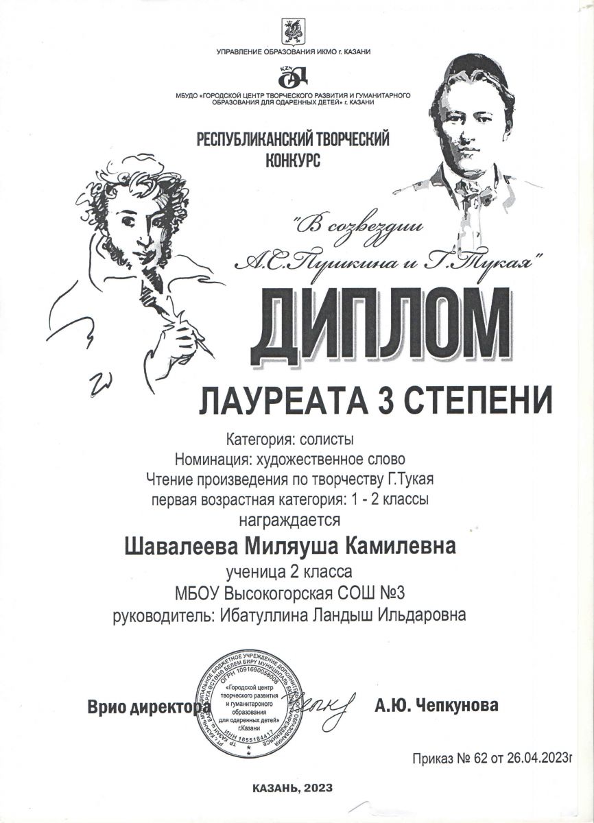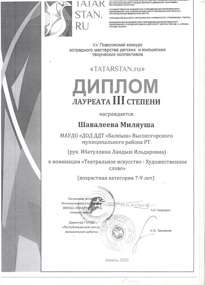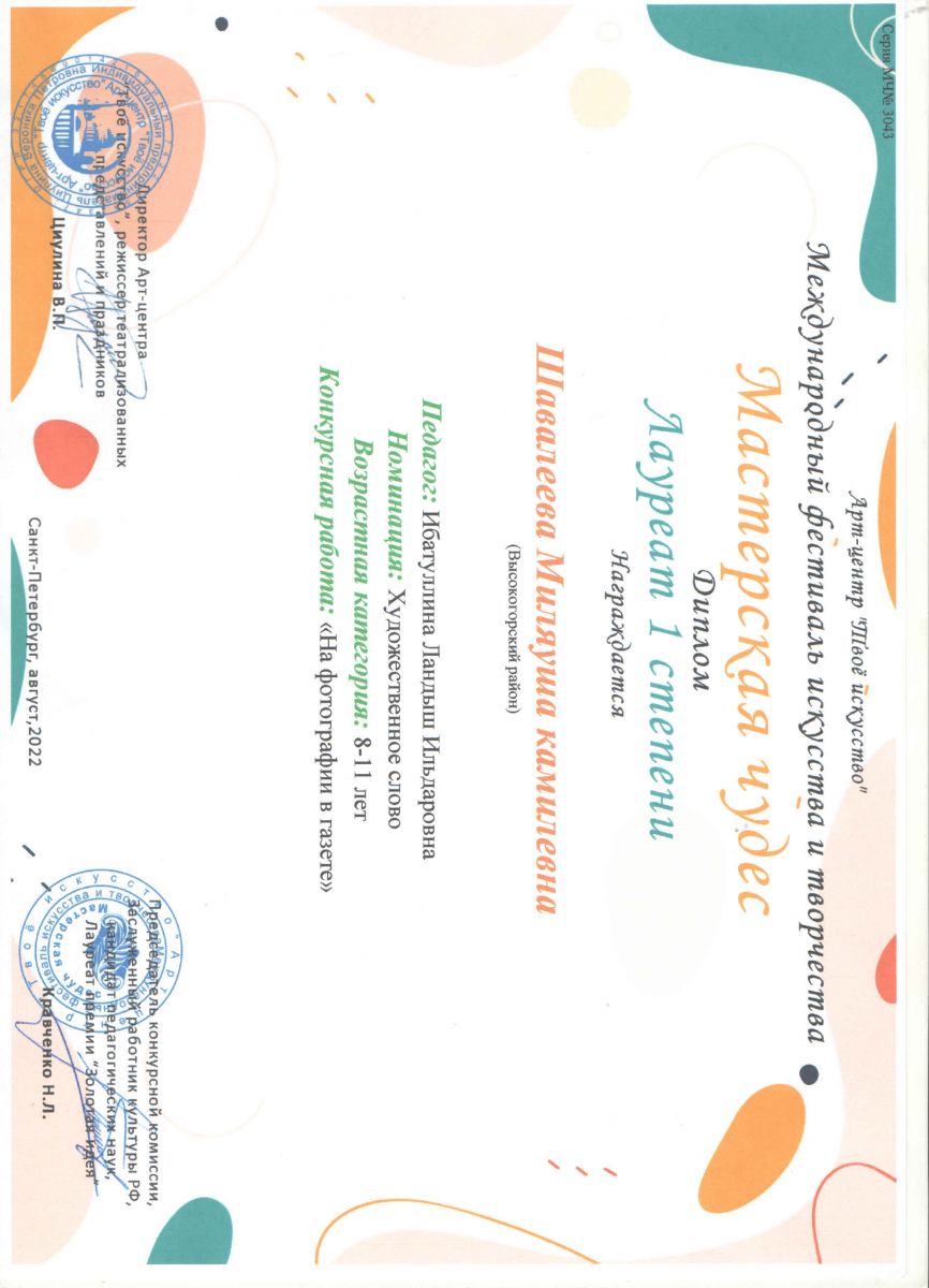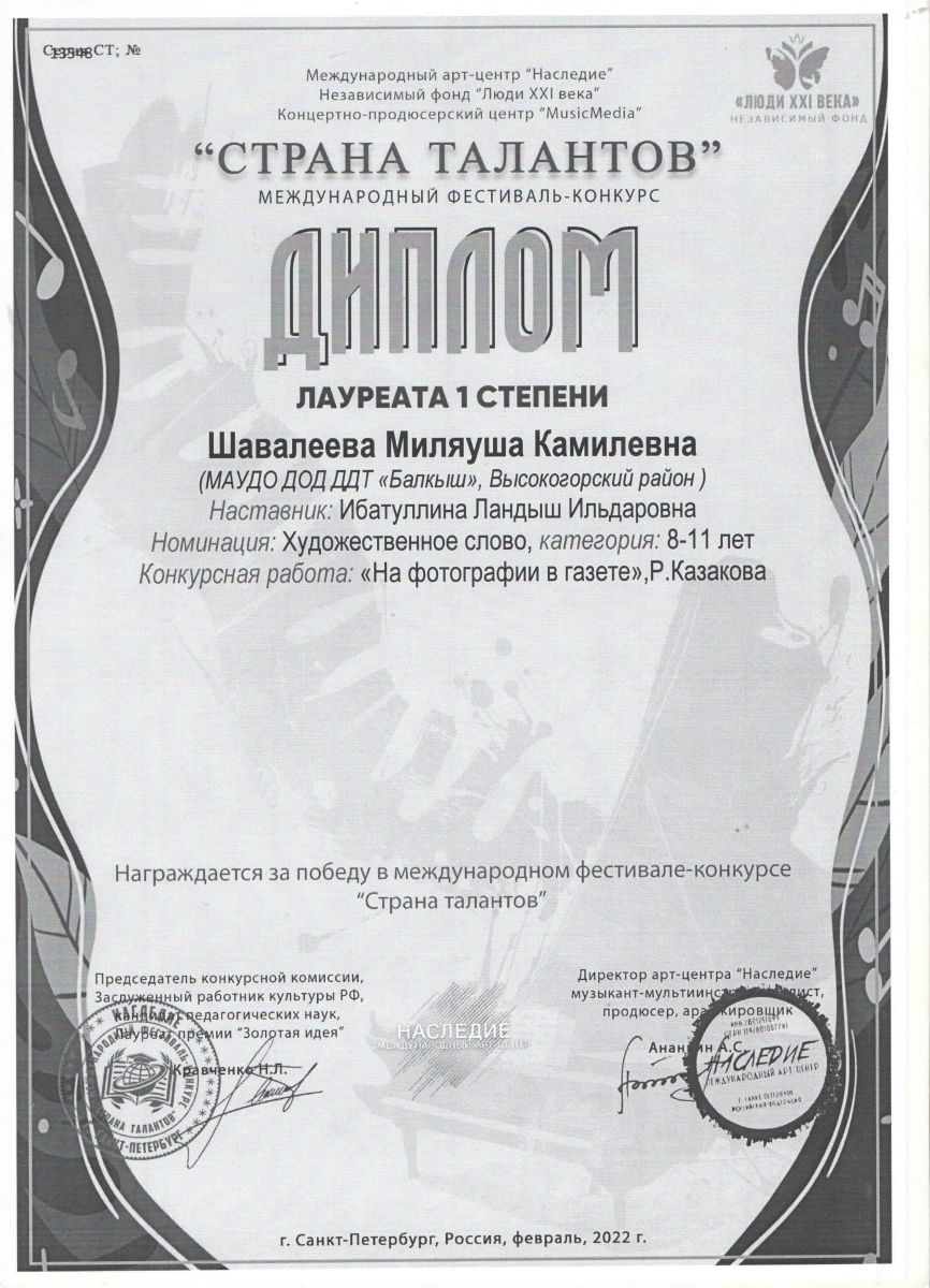 Шавалеева Миляуша - Международный фестиваль-конкурс "Страна талантов", лауреат 1 степени