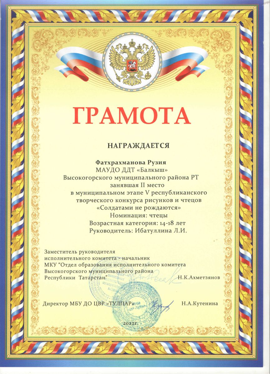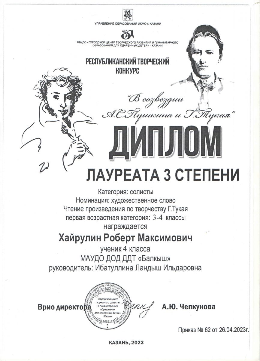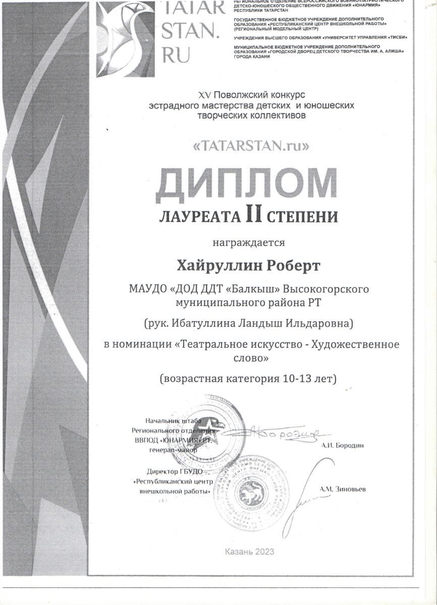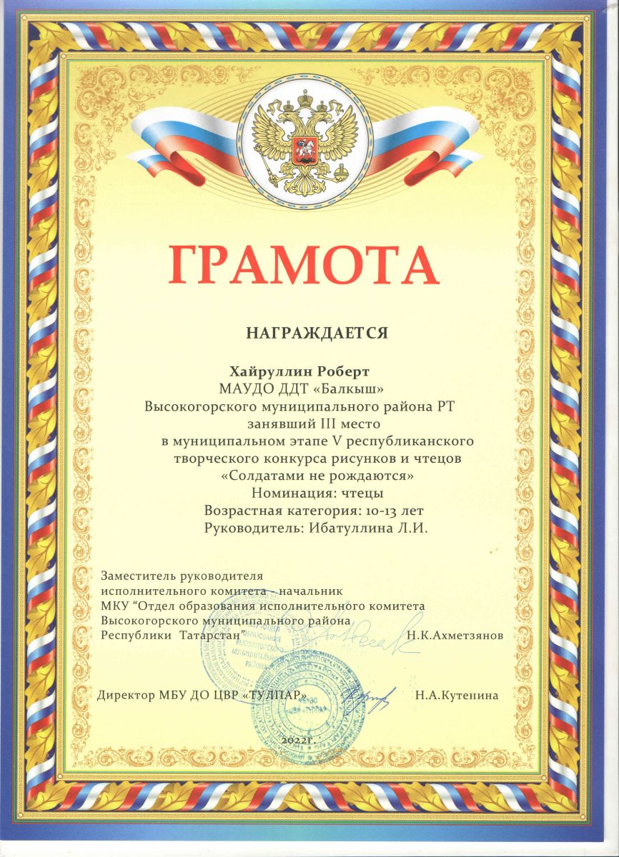 Хайруллин Роберт - Республиканский конкурс-фестиваль "Патриоты России",лауреат 1 степени