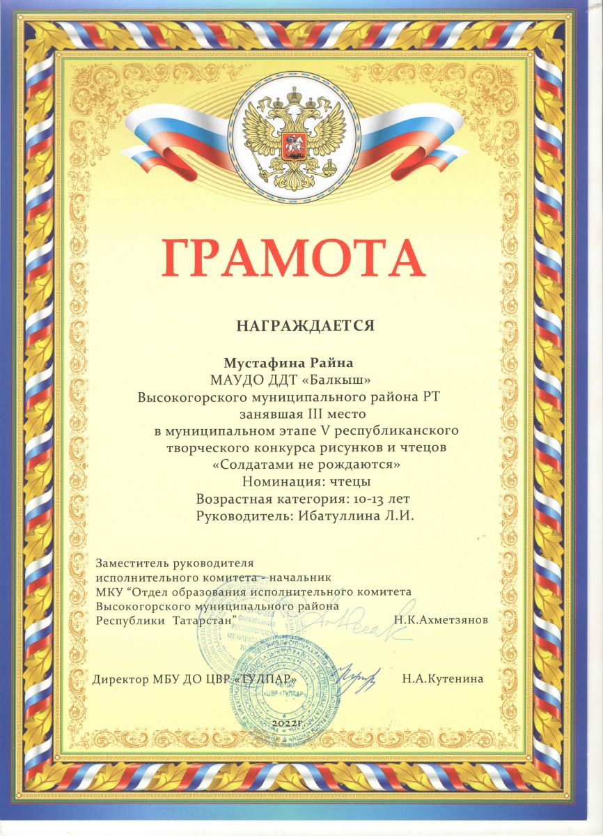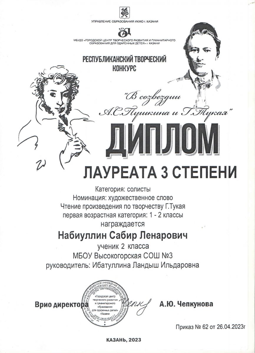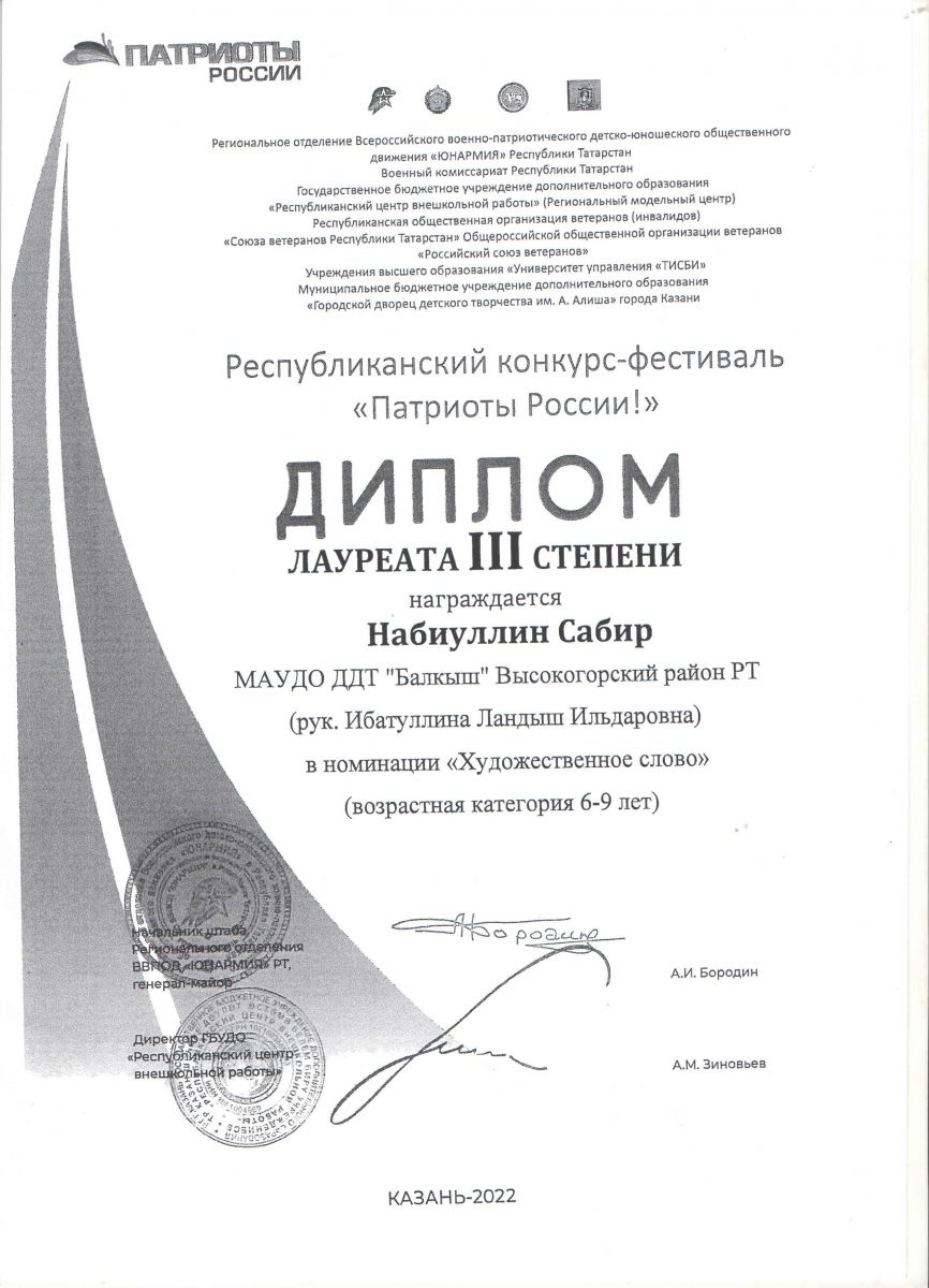 Набиуллин Сабир -Республиканский конкурс-фестиваль "Патриоты России", лауреат 3 степени