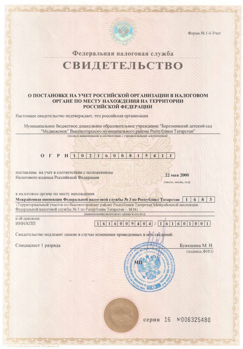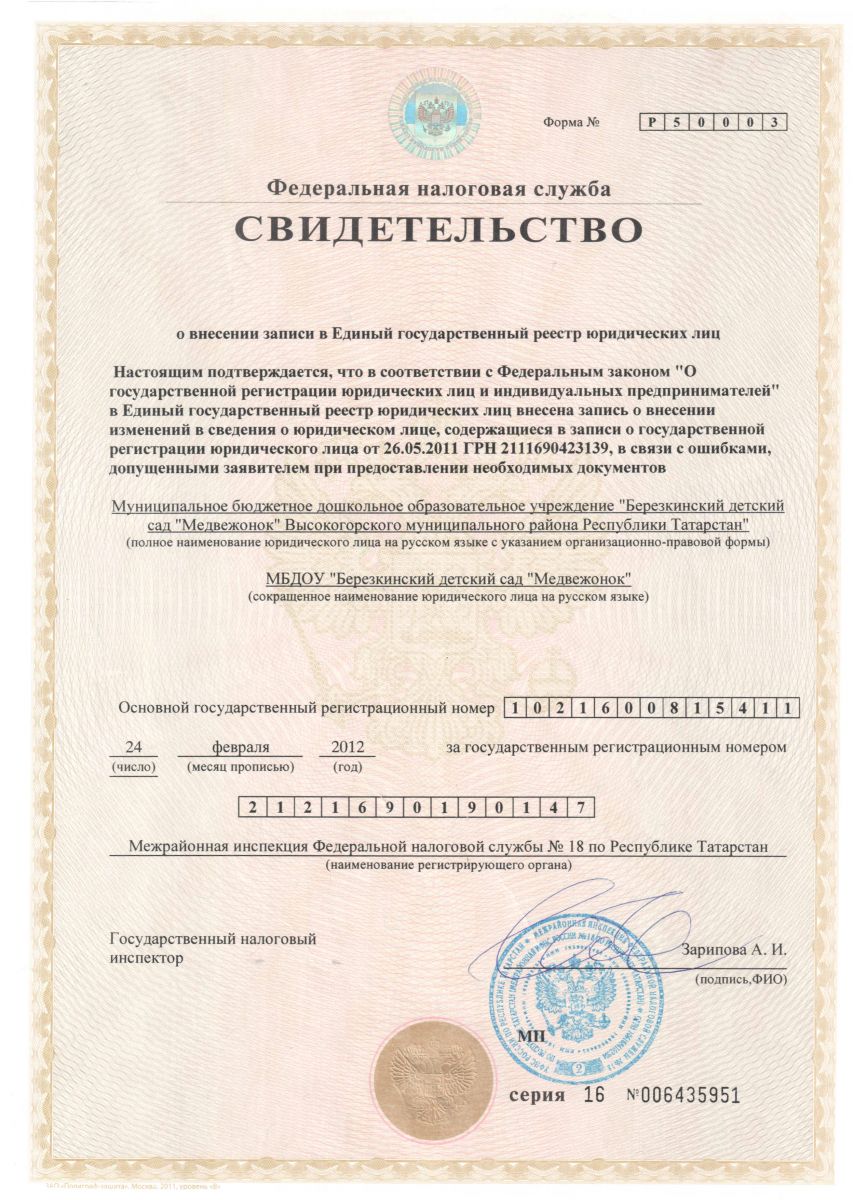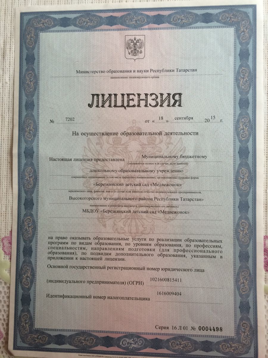 | Короткое название: | МБДОУ "Березкинский детский сад "Медвежонок" Высокогорского муниципального района Республики Татарстан" |