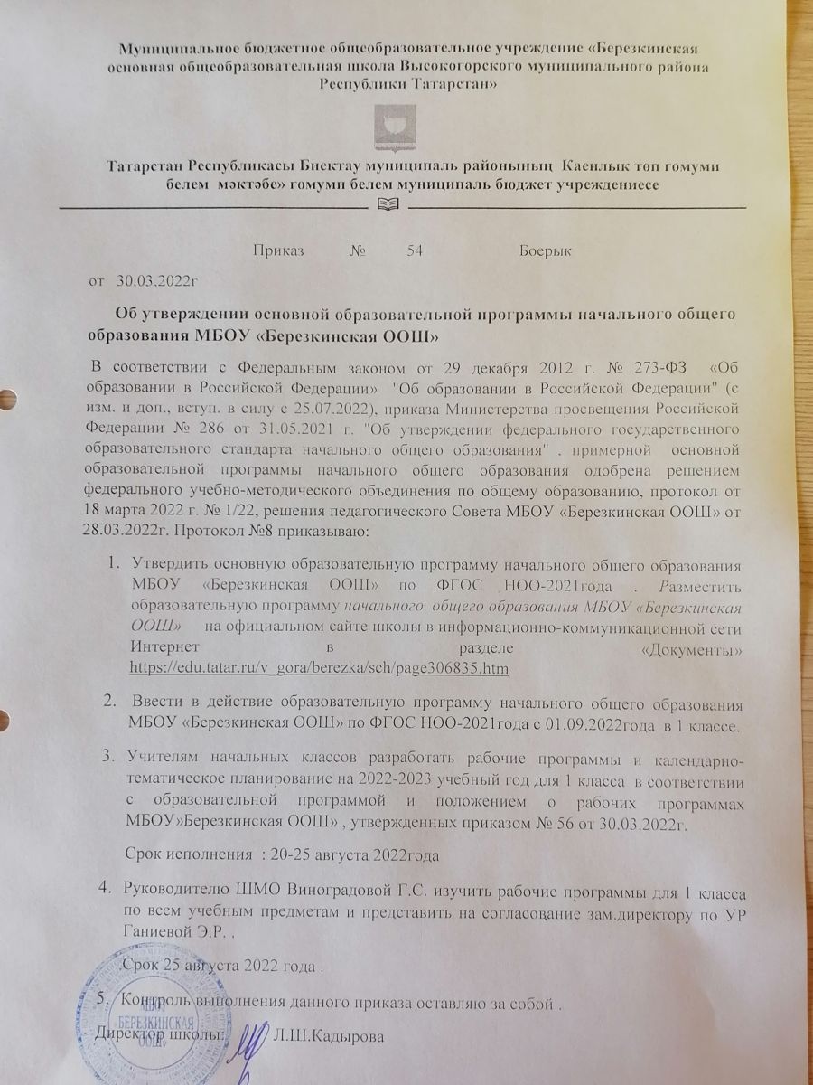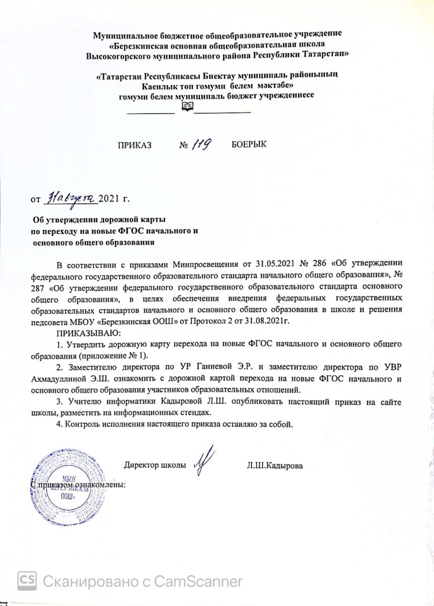 Приказ и план методической работы по переходу ФГОС-2021 МБОУ "Березкинская ООШ"