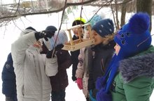 Открытие "Столовой для пернатых друзей". Дети начальных классов со своими родителями смастерили комушки.