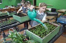 "Огород круглый год" - так называется кружок, которым руководит Г.А.Приказчикова. Действительно, работа там кипит в любое время года. Вот и сейчас школьники выращивают витаминную траву.