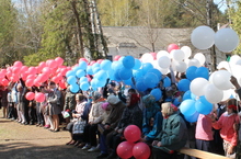 Дружными рядами с шарами с георгиевскими ленточками на груди пришли школьники к обелиску.