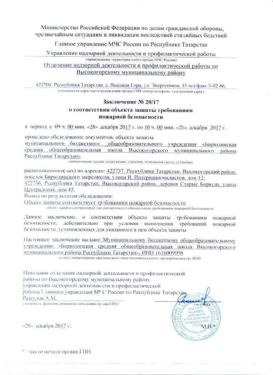 Заключение №20/17 о соответствии объекта защиты требованиям пожарной безопасности