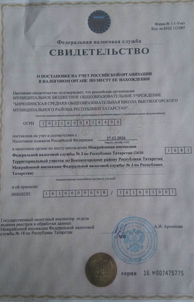 о постановке и снятия с внутришкольного учета муниципального бюджетного общеобразовательного учреждения "Бирюлинская средняя общеобразовательная школа Высокогорского муниципального района Республики Татарстан"