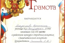 6 февраля в ВСОШ №3 прошел финал конкурса отрядных вожатых "Замечательный вожатый 2014". Нашу школу представили ученица 8 класса Гладышева Кристина и её подшефный 2 класс. За звание лучшего вожатого боролись учащиеся 7 школ района. Наша ученица заняла 3 место и получила грамоту за "Знание правил дорожного движения". Поздравляем.