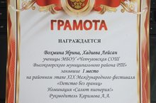 Участники РДШ под руководством педагога-организатора Каримовой А.А.приняли участие в районном этапе XIX Международного фестиваля "Детство без границ".Номинация "Салют, пионерия" и заняли почетное 1 место. Поздравляем наших участников.