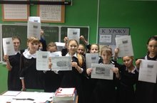 Участники РДШ провели акцию " А ты проголосовал за Казань", они раздали в школе памятки по голосованию за символы Казани на новых банкнотах Банка России